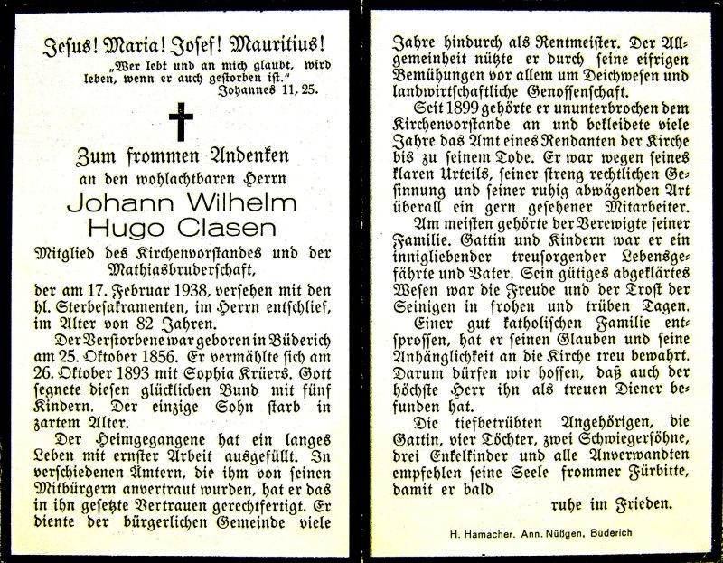 ∞ 26.10.1893 Sophia Krüers; 5 K., davon 1 früh †; Rentmeister d. bürgerl. Gemeinde; Verdienste um Deichwesen u. Landw. Genossenschaft; seit 1899 Mitgl. Kirchenvorstand; Matthiasbruderschaft |