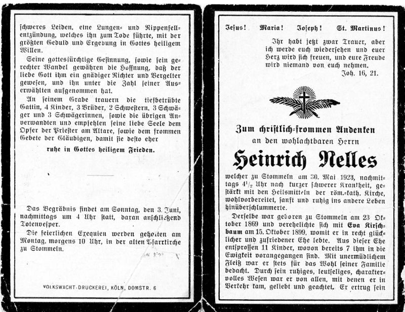 ∞ 15.10.1899 Eva Kirschbaum; 11 K., davon 7 verstorben; Tod durch Lungen- und Rippenfellentzündung |