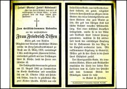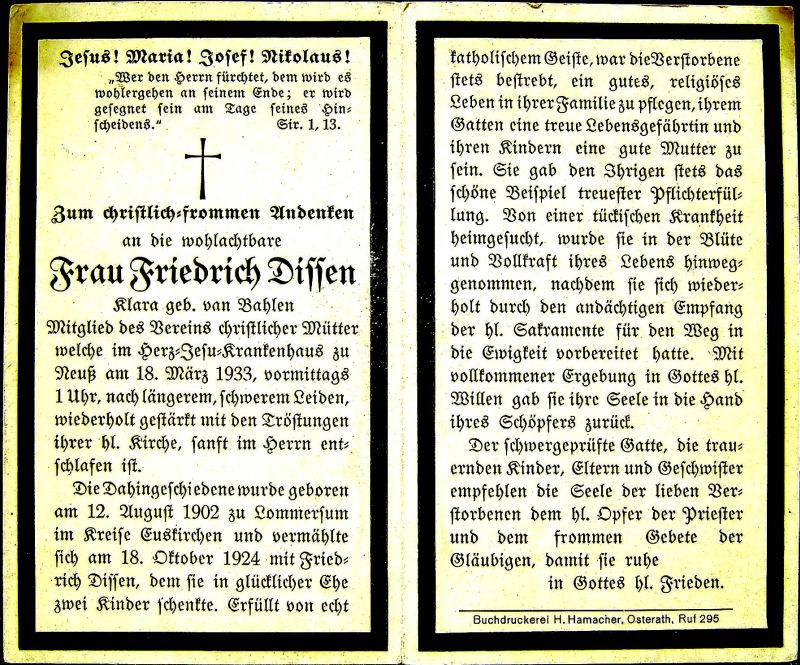 Längeres, schweres Leiden; ∞ 18.10.1924 Friedrich Dissen; 2 K.; Druck in Osterath |