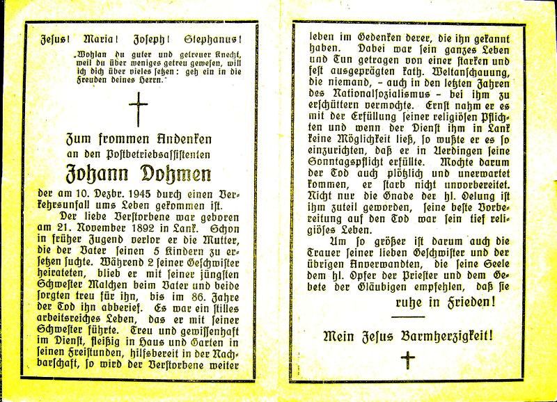 Tod durch Verkehrsunfall; Postbetriebsassistent in Lank; lebte mit s. jüngsten Schwester Malchen beim Vater, der mit 86 J. †; |