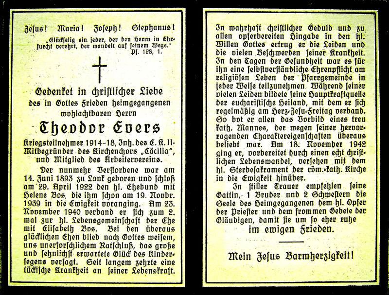 Kriegsteilnehmer 1914-18; Mitgl. Kirchenchor u. Arbeiterverein in Lank; ∞ 29.4.1922 Helene Bos, †; ∞ 23.11.1940 Elisabeth Bos; seit langem tückische Krankheit |