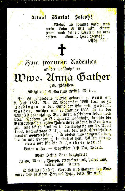 ∞ 22.11.1869 in Uerdingen Johann Gather, † 7.1.1895; 4 K., davon 1 †; zunächst wohnhaft in St. Hubert, in den letzten Jahren in Kempen |