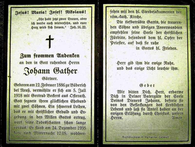 ∞ 5.7.1918 Gertrud Beckers aus Osterath; 2 Söhne; langes, schweres Leiden |