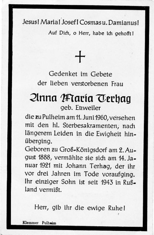 ∞ 14.1.1921 Johann Terhag, † vor 3 J.; einziger Sohn seit 1943 in Rußland vermißt (2. Weltkrieg) |