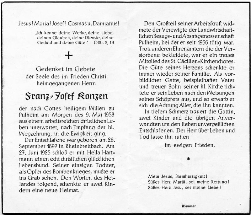 ∞ 27.6.1925 Hella Hartmann; einzige Tochter † durch Bombenkrieg (Opfer 2. Weltkrieg); 2 Adoptivkinder; seit 1936 bei Landwirtsch. Bezugs- u. Absatzgenossenschaft. In Pulheim |