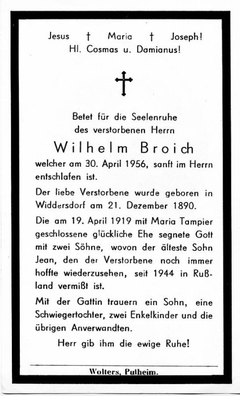 ∞ 19.4.1919 Maria Tampier; 2 Söhne, davon der älteste Sohn Jean seit 1944 in Rußland vermißt (2. Weltkrieg) |