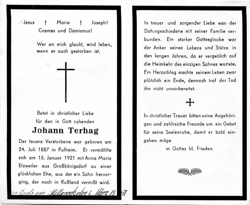 ∞ 15.1.1921 Anna Maria Etzweiler aus Größkönigsdorf; 1 Sohn, in Rußland vermißt (2. Weltkrieg) |