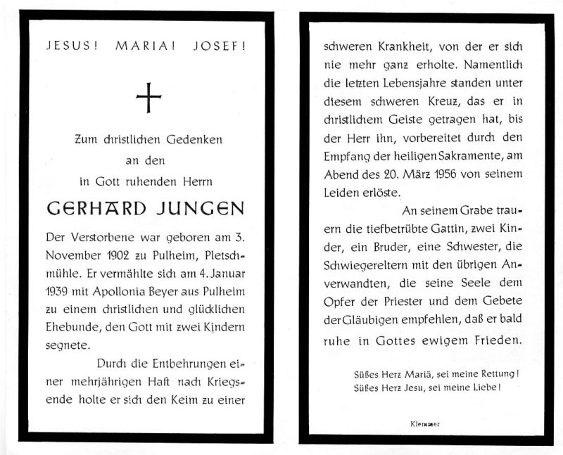 ∞ 4.1.1939 Apollonia Beyer aus Pulheim; 2 K.; mehrjährige Haft nach Kriegsende 2. Weltkrieg, holte sich dabei Keim einer schweren Krankheit, von der sich nie mehr ganz erholte |