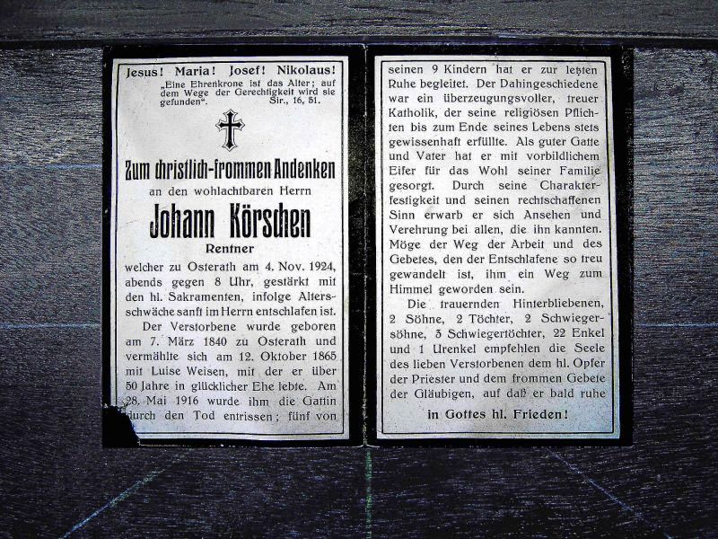 Rentner; ∞ 12.10.1865 Luise Weisen, † 28.5.1916; 9 K., davon 5 †; |