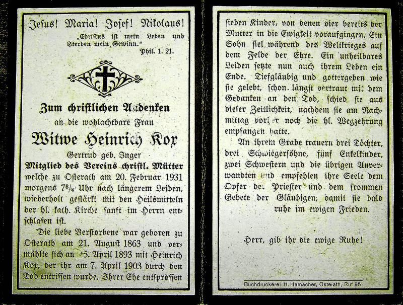 Längeres Leiden; ∞ 15.4.1863 Heinrich Kox, † 7.4.1903; 7 K., davon 4 †; 1 Sohn im 1. Weltkrieg gefallen; |
