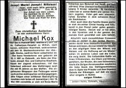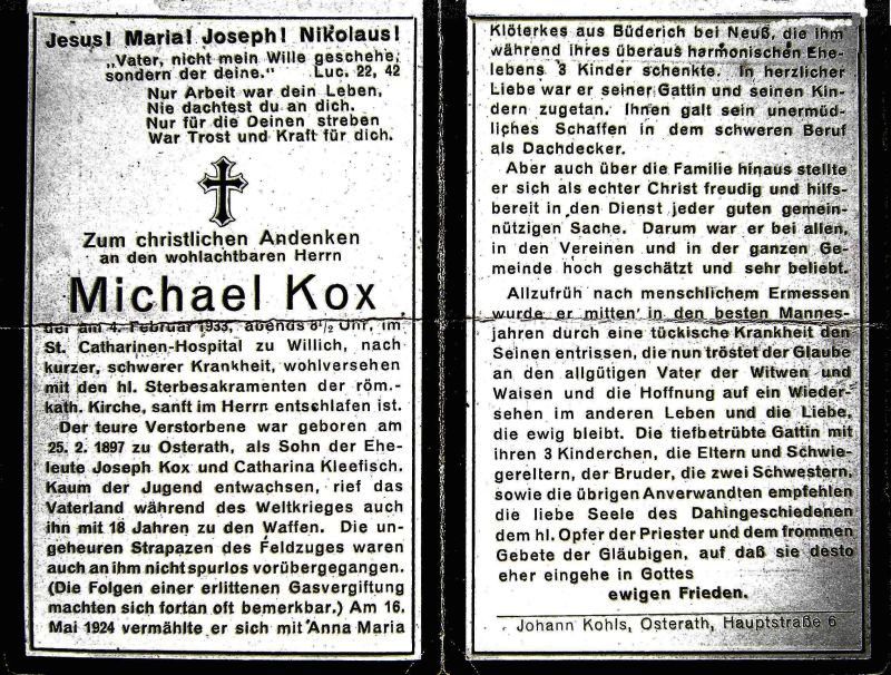 Eltern: Joseph Kox u. Catharina geb. Kleefisch; Soldat im 1. Weltkrieg; erlitt Gasvergiftung, unter deren Folgen er litt; ∞ 16.5.1924 Anna Maria Klöterkes aus Büderich b. Neuss; 3 K.; Dachdecker; tückische Krankheit |
