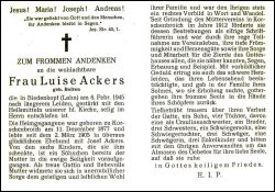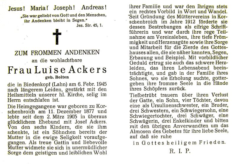 Längeres Leiden; ∞ 2.3.1905 Josef Ackers; 6 K., davon 1 früh †; Schriftführerin im Mütterverein; |