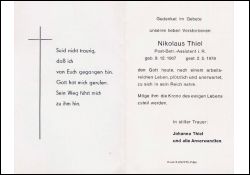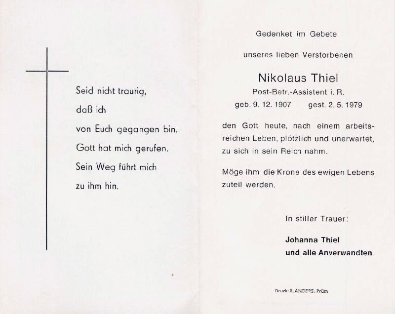 Ehefrau Johanna Thiel; Post-Betr.-Assistent i. R.; Druck in Prüm |
