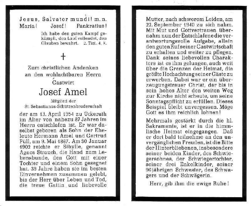 Fast 87 J.; Gastwirt; Mitgl. St. Sebastianus-Schützenbruderschaft; Eltern: Hermann Amel u. Gertrud geb. Püll; ∞ 30.1.1902 Sibylla, genannt Agnes Strauch, nach schwerem Leiden † 22.9.1940; 2 K.; |