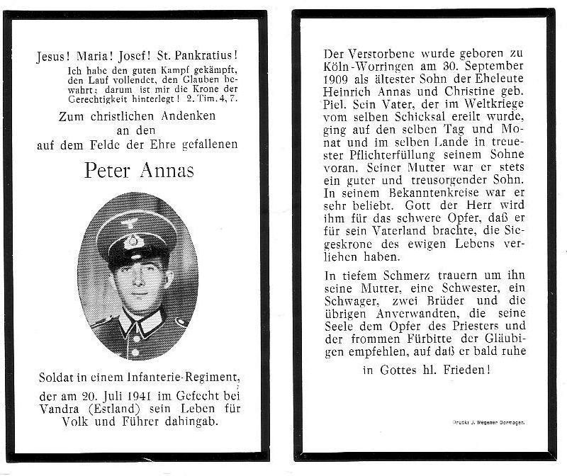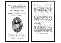 Gefallener 2. Weltkrieg; Eltern: Heinrich Annas u. Christine geb. Piel; sein Vater am selben Tag gefallen |