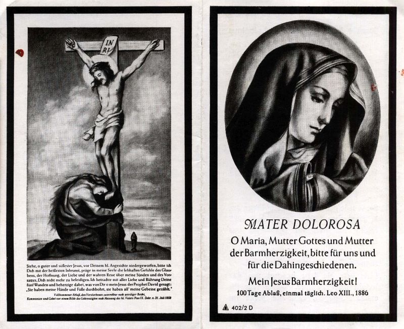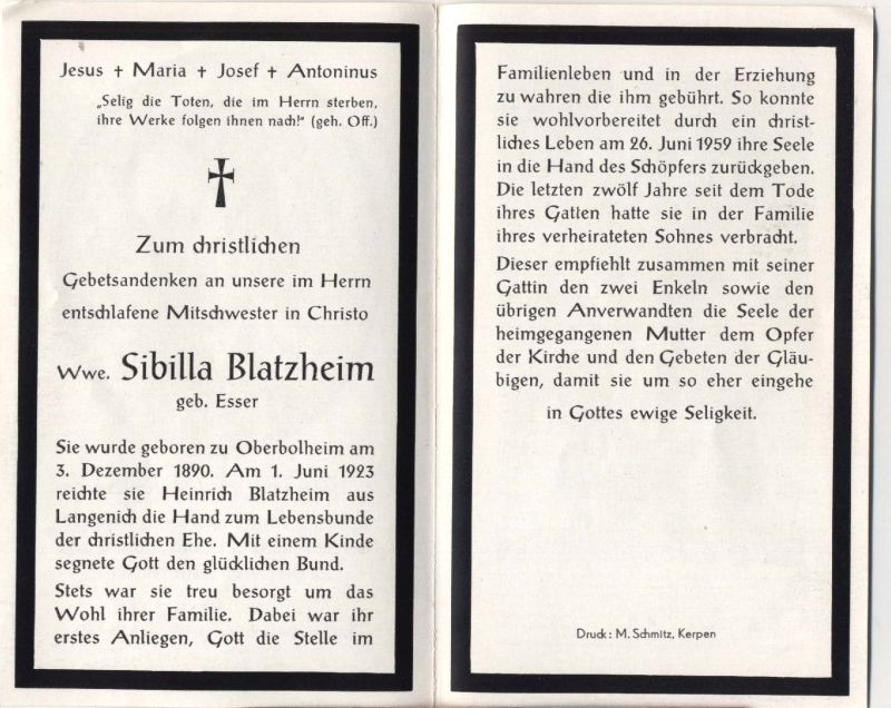 ∞ 1.6.1923 Heinrich Blatzheim aus Langenich; 1 K.; nach dem Tod ihres Gatten vor 12 J. lebte sie in der Familie ihres verheirateten Sohnes; Druck in Kerpen |