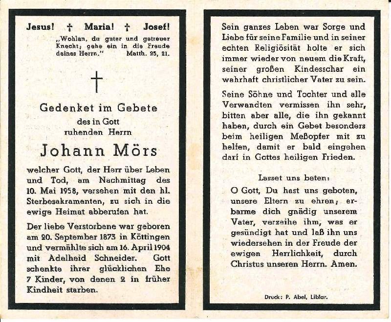 ∞ 16.4.1904 Adelheid Schneider; 7 K., davon 2 früh †; Druck in Liblar |