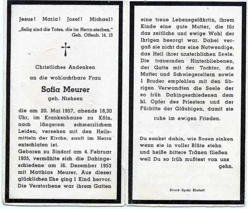 ∞ 16.12.1953 Matthias Meurer; 1 K.; längeres Leiden; Druck in Elsdorf |