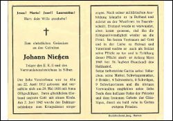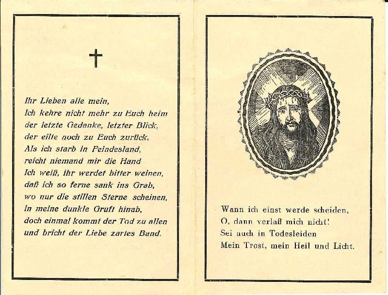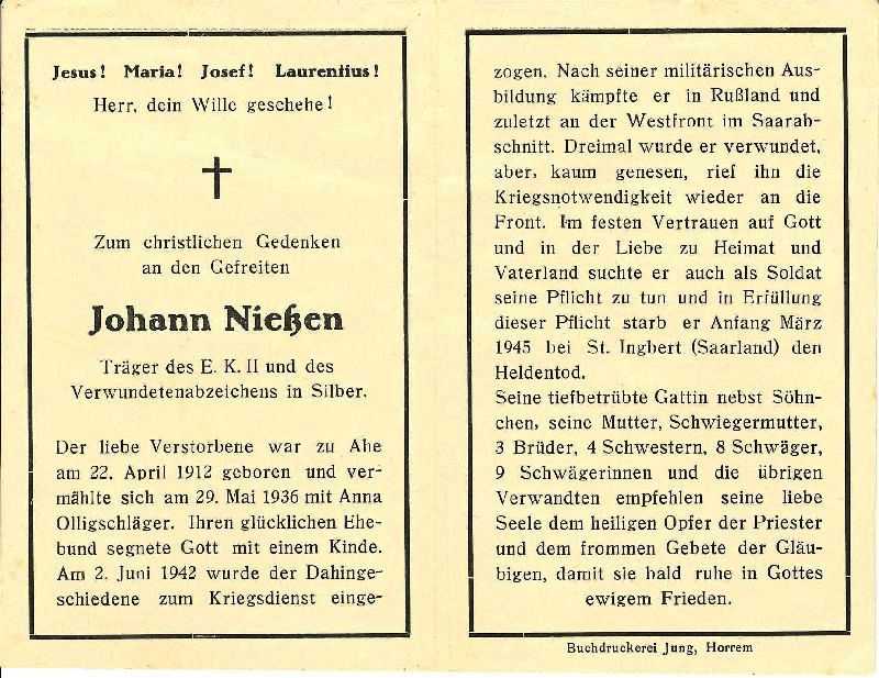 Gefallener 2. Weltkrieg; ∞ 29.5.1936 Anna Olligschläger; 1 K.; 2.6.1942 Einberufung; zuerst in Rußland, dann Westfront im Saarabschnitt; |