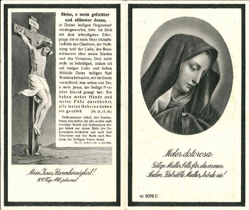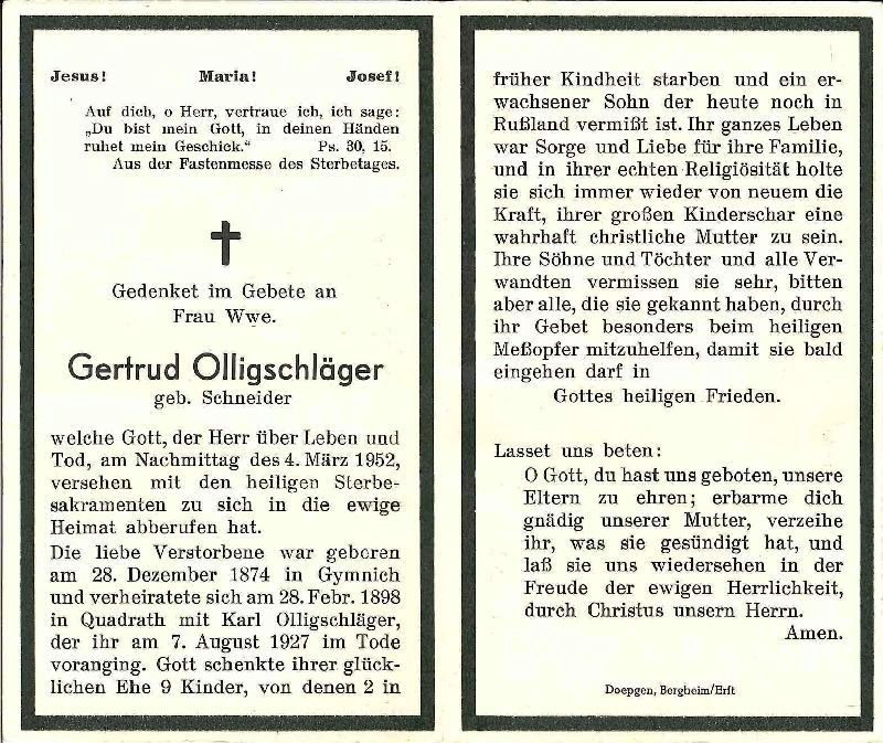 ∞ 28.2.1898 in Quadrath Karl Olligschläger, † 7.8.1927; 9 K., davon 2 früh †, 1 Sohn im 2. Weltkrieg in Russland vermisst; Druck in Bergheim/Erft |