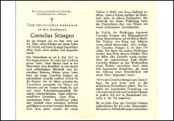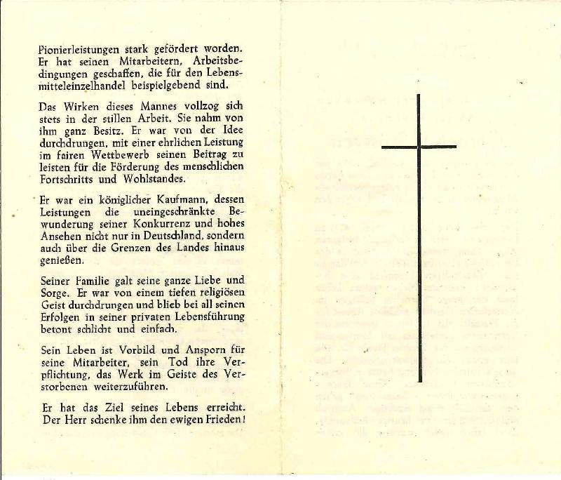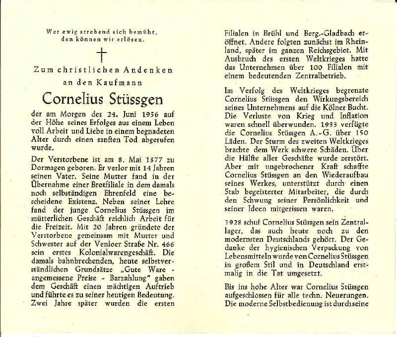 Kaufmann; verlor Vater mit 14 J.; Mutter übernahm Brotfiliale in Ehrenfeld; mit 20 J. auf Venloer Str. 466 erstes Kolonialwarengeschäft: nur Barzahlung, hygienische Verpackung; 2 J. später Filialen in Brühl u. Bergisch Gladbach; bis 1914 100 Filialen; verluste durch Krieg u. Inflation; 1933 hatte Cornelius-Stüssgen AG 150 Läden; schwere Schäden im 2. Weltkrieg; Wiederaufbau; 1928 Gründung des Zentrallagers; moderne Selbstbedienung; |