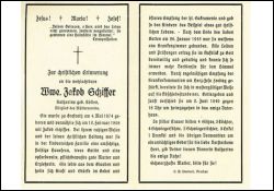 ∞ 12.02.1898 Jakob Schiffer 26.01.1945 †; Mitglied des Müttervereins; in Trauer 4 Söhne u. 5 Töchter; Druck: O.B.Dennert, Frechen; |