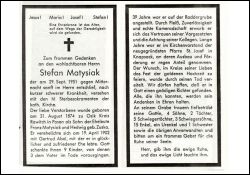 Eltern Franz Matysiak und Hedwig geb. Zuska; ∞ 19.04.1902 Gertrud Abel; 9 Kinder, 3 †; 39 Jahre auf der Roddergrube; Kirchenvorstand an St. Josef Knapsack; |