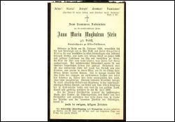 ∞ 04.05.1848 mit Engelbert Stein; Gutsbesitzerin in Köln-Volkhoven; 1898 goldene Jubiläum der Ehe; 4 Kinder bereits verstorben; |