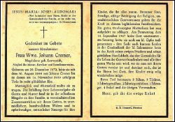 ∞ 30.08.1899 Johann Cremer, 16.11.1939 † ; 2 Söhne, 3 Töchter; |