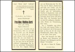 ∞ 12.11.1910 Matthias Durst, 20.11.1938 † ; 1 Sohn Peter; Gastwirtin; Mitglied des Müttervereins; |