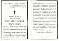 ∞ 01.06.1902 Peter Schiefer; Sohn Wilhelm in Westpreussen Heldentod 1945 †; Mitglied des Müttervereins; |