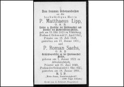 Rektor u. Professor d.Studienanstalt u. Direktor des Klosterseminars Metten; sowie P. Roman Sachs, OSB; Geschichtsprofessor; * 01.01.1821 - 18.01.1891 †; |