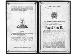 Vater Graf Mastai-Ferretti; 11.0.1819 in Rom Priesterweihe; 1827 Erzbischof von Spoleto, 1832 von Imola und 1840 Kardinal; 21.06.1846 zum Papst gekrönt; |