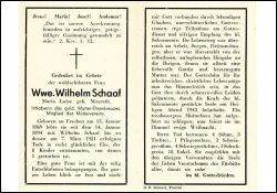 ∞ 14.01.1894 Wilhelm Schaaf, 07.03.1921 †; 8 K., davon 1 †: Inhaberin des gold. Mutter-Ehrenkreuzes; Mitglies des Müttervereins; |