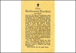 Vor der Ehe als Lehrerin tätig; ∞ 1889 Heinrich Franken, Hauptlehrer in Köln; 4 K.; Sohn 1916 bei Ypern im 1. Weltkrieg mit 24 J. gefallen; Lebensabend in Düsseldorf |