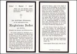 ∞ 15.10.1911 Leonhard Becker aus Habbelrath; 5 Kinder, davon 3 † ; letzte Ruhestätte auf dem Heimatfriedhof Grefrath; |