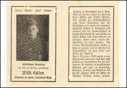 im 2. Weltkrieg gefallen; Eltern Peter Köllen und Sibilla Wiedenfeld; Gefreiter in einem Infanterie-Reg.; |