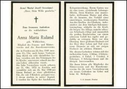 ∞ 26.05.1900 Simon Ruland; 8 Kinder, davon 4 † ; Mitglied des Frauen- und Müttervereins und des Rosenkranzvereins; |