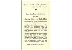 ∞ 06.04.1940 Adalbert Schäfer; 2 Kinder; Mitglied des kath. Frauen- und Müttervereins St. Audomar; |