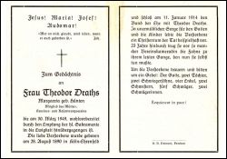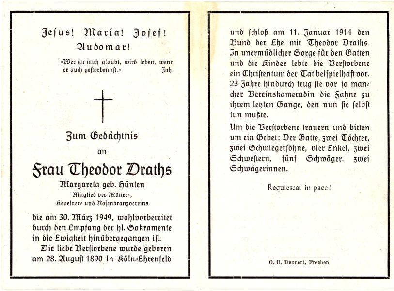 ∞ 11.01.1914 mit Theodor Draths, 2 Töchter; Mitglied des Mütter-, Kevelaer- u. Rosenkranzvereins; |