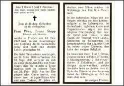∞ 18.09.1888 mit Franz Stupp, 26.02.1929 †; 10 Kinder, davon 2 im jugendlichen Alter, 1 Tochter mit 27 J. † , 2 Söhne im Weltgrieg gefallen; |