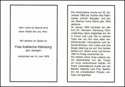 Eltern Fabrikant Johann Geusgen und Anna Maria geb. Wolf; ∞ 01.1920 Dr. Hermann Kleinsorg, Arzt; 2 Söhne, davon 1 Sohn seit Januar 1945 im Krieg verschollen; |