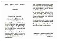 Eltern Dr. med. Conrad Linzbach und Anna Maria Stemmer; übernahm 1903 Haus Horr im Kreise Grevenbroich; ∞ am 11.10.1911 mit Katharina Pingen vom Kistenmacher Hof; 7 Kinder; |