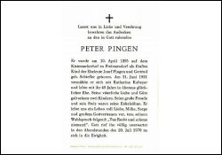 Eltern Josef Pingen und Gertrud geb. Schieffer; ∞ am 21.06.1921 mit Katharina Kalteyer; 2 Kinder; |