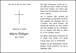 Eltern Franz Fleuster und Helene geb. Schmitz; ∞ am 17.02.1931 mit Hubert Röllgen - 10.10.1972 † - aus Berzdorf bei Brühl; 4 Kinder; |