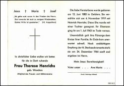 ∞ am 04.11.1919 mit Heinrich Henrichs; 1 Tochter; Ehemann am 01.07.1963 D |