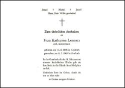 ∞ 15.11.1890 Nikolaus Kleyer, † 1939; 12 K., davon 6 † (5 in frühem Kindesalter, 1 Sohn im 2. Weltkrieg gefallen); Druck in Heinsberg |