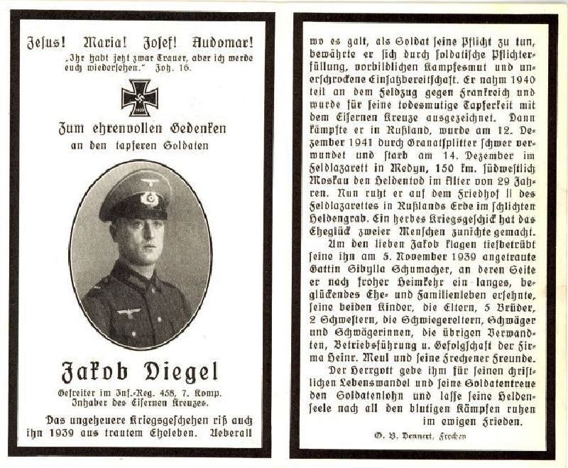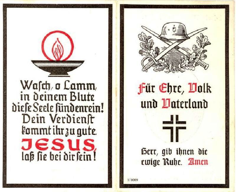 00 am 05.11.1939 mit Sibylla Schumacher; 1939 aus trautem Eheleben ins Kriegsgeschehen, 1940 Feldzug gegen Frankreich, am 12.12.1941 durch Granatsplitter schwer verletzt, am 14.12.1941 in Russland gestorben; |