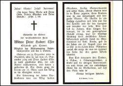 ∞ am 15.09.1889 mit Peter Hubert Esser † 16.03.1928; 8 Kinder, davin 1 gestorben, Mitglied des Müttervereins, Rodenkranzvereins und des 3. Ordens. |