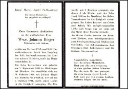 ∞ am 21.02.1914 mit Johann Heger aus Frechen-Bachem, † am 07.10.1924 durch Unfall; 7 Kinder, davon 3 als Kinder gestorben sowie Sohn Josef 1940 an der Westfront gestorben; |